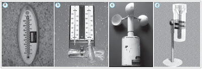 | Gambar: Alat pengukur cuaca dan iklim; a&b: termometer, c: anemometer dan d: pluviometer |